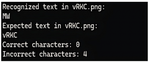 Results for each image, including recognized text, expected text, correct and incorrect character counts, are printed. All recognized characters across images are collected, sorted alphabetically, and printed at the end. The script includes error handling to catch and print any issues during file reading or processing. This process ensures that images are optimally prepared for OCR, maximizing recognition accuracy and providing a detailed comparison of OCR results against expected values. A sample result for OCR test conducted is shown in Figure 4. It was observed that the OCR test failed to identify correct characters 93% of time it was applied. However, the users could successfully recognize the characters of CAPTCHA with an accuracy of up to 87.5%.
