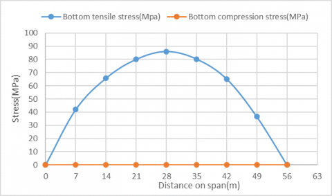 Pulling stresses do not appear at the top of steel girders, but they have compression stresses, and the higher value is -55MPa, which is lower than the allowable compression stress of 207MPa. Bottom of steel girder center has maximum value of tensile stress, which is 86MPa, less than allowable compression stress of 207MPa. This indicates that the bridge span has enough bearing capacity. Figure 11 shows Pulling and Crushing stresses on top of steel girders due to loads combination case along the span length, and Figure 12 shows tensile and compression stresses on the bottom of steel girders due to loads combination case along the span length.