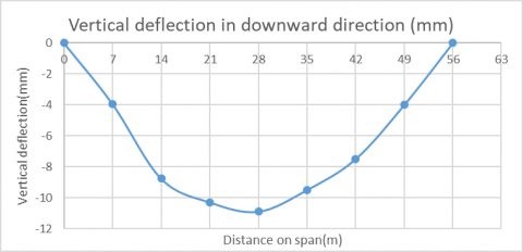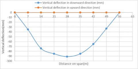 Figure 14. Viewing of vertical deflection in downward direction due to loads combination case along steel girder span length