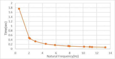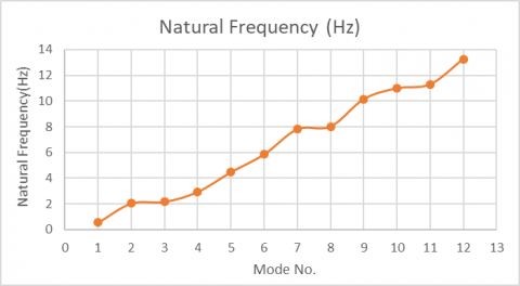 Mode No. 4's natural frequency of 2.95Hz was chosen because it reflects the typical downward deflection shape of steel girder spans under the influence of the structure's self-weight load. The natural frequency values and mode number for the steel I-girder bridge span are displayed in Figure 15. The link between time and mode number is depicted in Figure 16. The relation between time and natural frequency is depicted in Figure 17. The results of a modal analysis for a steel I-girder bridge span under the influence of the structure's self-weight are displayed in Figure 18.