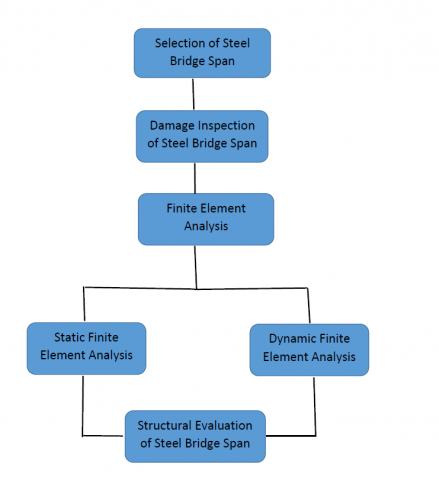 The methodology of this study includes selection of bridge structure, damage inspection of structural parts of steel span of bridge structure, numerical static analysis, and numerical dynamic analysis. Figure 1 explains the flow chart of methodology of study.