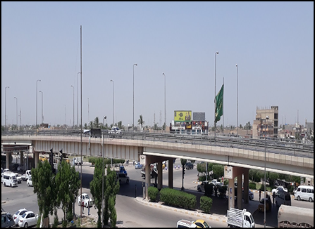In this study, Al-Thawra Bridge has been chosen to assess the structural performance because this bridge is significant due to its position in Babylon City in central Iraq. It is a composite bridge which is consists of I-steel girder span with eight precast prestressed concrete I-girders. This bridge was designed and constructed by Abdullah Owiz General Contracting Company and its construction began in 2010 as part of a strategic project aimed at alleviating traffic congestion at the entrance of Al-Hillah city and connecting Baghdad to the southern governorates. The bridge was designed with a total length of 488m and a width of 18.25 m, featuring Iraq's longest intermediate span of 56 meters. Originally planned for completion within 20 months, the bridge was successfully constructed in just 17 months due to favorable weather and dedicated engineering efforts. Originally planned for completion within 20 months, the bridge was successfully constructed in just 17 months due to favorable weather and dedicated engineering efforts. As mentioned above, it consists of nine spans. Eight of them are precast prestressed concrete I-girder section with 24 m length for each span and one of them is steel I-girder span, which has 56 m length. This study will select a steel-girder span to predict static and dynamic forces. This span has two bent supports. Each bent has three circular piers with 1.2 m diameter and 5 m height. Figure 2 shows the Al-Thawra bridge location, Figure 3 shows the Al-Thawra bridge structure, and Figure 4 shows the steel I-girder span layout and appearance.