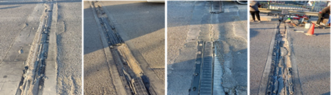 Damage inspection findings of the steel I-girder span indicated significant harm in the structural elements of the bridge. Steel I-girders span exhibit no indications of rust or corrosion. The obstruction must be cleared, and the rainfall drainage system must be repaired. It would also be wise to apply a moisture-resistant coating to the steel I-girders. It can be noted that from damage inspection, the main problem is in the expansion joints, which need to be repaired or replaced. Figure 5 shows the damage of expansion joints.
