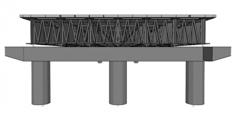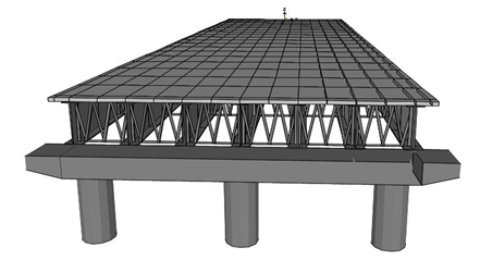Numerical static and dynamic analysis of steel I-girder span is done by using CSI-Bridge Ver.25, which uses finite element analysis method. The type of area object model is shell element with maximum submish size is 1.2m. Maximum segment length of concrete deck, concrete piers and concrete pier caps is 3 m, respectively. The type of steel for girders is A709Gr50 with fy is 344MPa (50ksi). For concrete deck and substructure, the compressive strength is 50MPa. The bearing type is simply supported as hinge and roller. This study adopted two load cases. Vehicle traffic load case and loads combination case. Vehicles traffic load case represents the live load which uses vehicle in AASHTO type HS20-44. Load combinations comprise Permanent load, Pre-tensioned load, Dynamic vehicle load, temperature load, wearing surface, and wind load. Figure 6 shows the steel I-girder span model.