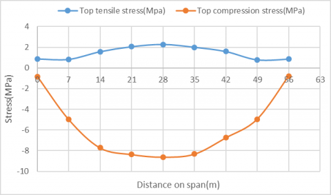 Figure 11. The tensile and compression stresses on top of steel girders due to loads combination case along bridge spans length