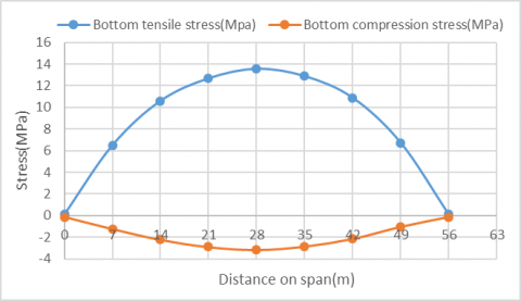 Figure 12. The tensile and compression stresses on bottom of steel girders due to loads combination case along bridge spans length