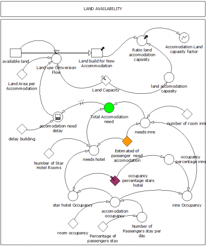 Land availability, a critical constraint supporting the growth of accommodation services related to increased HST passengers, is also modelled. Land allocation projections of ±4,000 hectares with an estimated 5% allocated for accommodation are visualized in Figure 4, emphasizing the spatial limitations considered in urban development plans. These integrated components establish a robust system dynamics framework, enabling the forecasting of future impacts of HST on passenger volumes and land use. This comprehensive model provides evidence-based support for more effective infrastructure planning, urban policy design, and sustainable regional development.