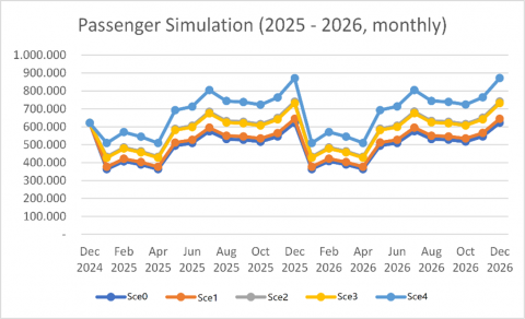 The simulation reveals clear cyclical patterns in ridership, with significant peaks during mid-year (June–July) and end-of-year (December), aligning with national holidays and seasonal travel surges. Among the five scenarios, Sce0, which represents a baseline or minimal-intervention strategy, consistently yields the lowest passenger volumes. In contrast, Sce4, which integrates multimodal connectivity, optimized fare structures, and tourism promotion, achieves the highest projected ridership, reaching nearly 900,000 passengers per month by the end of 2026.