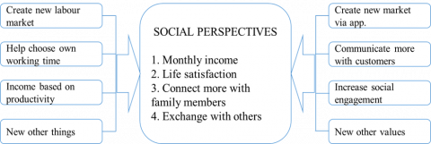 Compared to the construct of new values, the new labour market has the strongest effect on the social perspectives, as shown in Table 5. The variables that best explain the new labour market construct are: Helping driver partners to be proactive about working time (0.917); Helping driver partners choose appropriate and suitable jobs (0.911); Helping driver partners to be proactive in the workplace (0.902); and Helping driver partners improve their income based on productivity (0.897).