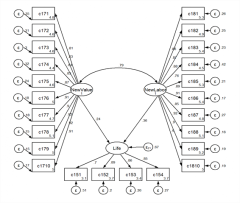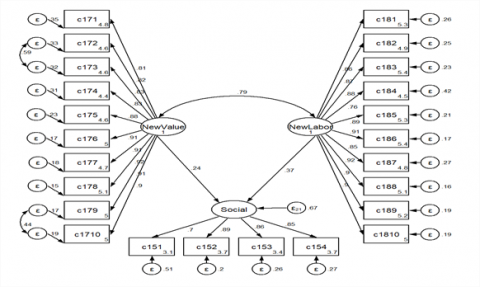 Preliminary empirical results of the analysis include the covariance value and the contribution of each item to the variable of social perspectives. The covariance value between the new labour market and new values is relatively high and significant at 0.79, meaning there is a solid relationship between these two variables. From the social perspective, the aspect of job fulfillment/life satisfaction is the primary contributor to this construct with a value of 0.89. And via SEM, both the two latent constructs of new values and new labour market have significant impacts on the social perspectives: These results are discussed in detail, as shown in Table 5.