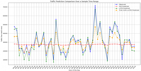 Figure 8. (a) Traffic prediction comparison over hour of the day; (b) Traffic prediction comparison over a sample time range