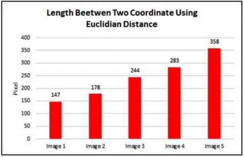 From the results of these coordinate points, the length (P) between the 2 coordinate points in the shrimp object is obtained in pixel units. The measurement method is to calculate the distance of the pixel points using the Euclidian distance. The calculation process uses Eq. (1). The length of the shrimp object obtained is P1=147 pixels, P2=178 pixels, P3=244 pixels, P4=283 pixels, P5=358 pixels. In detail the coordinates and the length of the 2 coordinate points of each image are shown in Table 1, and Figures 4 (b) and (c).