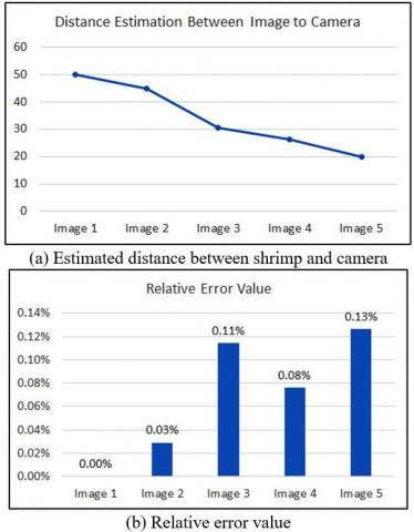 The experiment was continued in the process of calculating the distance between the shrimp and the camera. This process is calculated using Eq. (5). From the position of 1 shrimp that swims freely in front of the camera obtained 5 distances of shrimp with the camera. The process of calculating the distance between the camera and shrimp underwater uses the formula 2.5. The estimated distance values (D') detected are D1'=50 cm, D2'=44.82 cm, D3'=30.63 cm, D4'=26.25 cm, D5'=19.86 cm. From these 5 detected distances, the Relative Error (RE) value is obtained, the RE calculation process uses Eq. (10). RE values obtained are RE1=0%, RE2=0.03%, RE3=0.11%, RE4=0.08%, RE5=0.13%. In detail, the estimated distance between shrimp and camera is shown in Table 2 and Figure 7 (a), the RE value is shown in Table 2 and Figure 7 (b).