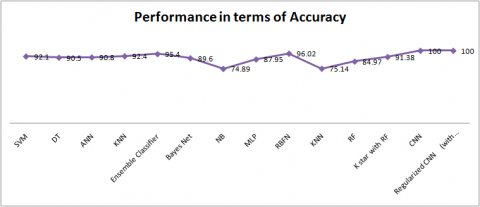 As shown in Table 3, after comparing experimental results with previous related work in same area, it is observed that only machine learning algorithms like Logistic Regression, Decision tree gave 100% accuracy as dataset is small (117 participants). Hence it can be concluded that CNN model and regularized CNN model implemented in this experiment giving highest accuracy of 100% for large dataset. Same comparative accuracy is plotted graphically in Figure 11.