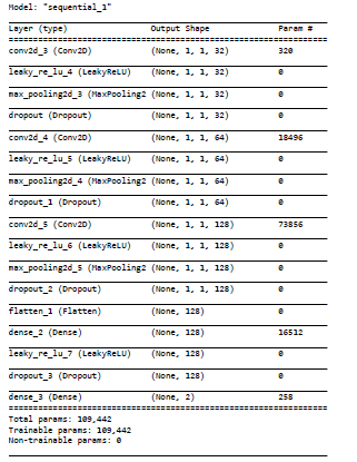The convlotution layer tries to find pattern or useful information in data. The feature extraction is carried out using 3X3 filters. In the obtained pool of data, the maximum features are sent to next layer using MaxPooling layer. The matrix is converted into vector using Flatten layer. And as we need to carry binary classification (depressed or not depressed), apply dense layer at the end.