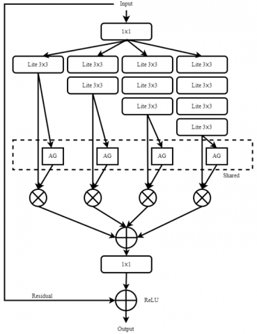 OSNet formed by assembling the light bottleneck layers with no pressure to dedicate the blocks at different depths (stages) of the network unlike the border bottleneck shown in Figure 1. Based on a multi-stream design, OSNet has similarities to ResNeXt [19] and Inception [20], but it also has significant distinctions. 1) The multi-stream architecture in OSNet is dependent on the exponent's scale-incremental rule, with each stream having its own field. These streams, however, organized using a particular Lite 3x3 layer (see Figure 2).