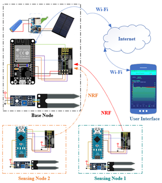 The proposed smart agriculture system is structured around a central base station node, interconnected with multiple sensing nodes. Utilizing NRF technology, these nodes efficiently gather agricultural data, which is then communicated to the base station. Equipped with robust power management systems and an effective solar panel, the system is designed to operate continuously, even in remote rural locations. The data collated at the base station is subsequently transmitted to the cloud, leveraging IoT technology, thereby facilitating rapid dissemination to a centralized server and enabling remote user access. This smart agricultural system, as illustrated in Figure 1, is specifically designed to meet these objectives.