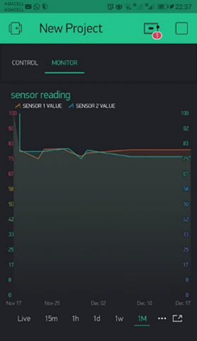 A mobile app, utilizing the Blync platform, has been developed for control and monitoring purposes. This app features two tabs: "Monitor" and "Control." The "Monitor" tab displays real-time data received from the sensing nodes, allowing remote monitoring of sensor values and data storage. In the "Control" tab, users receive notifications regarding critical system parameters, including water tank levels, pump motor status (ON/OFF), server connection status, and the Control terminal. The Control terminal facilitates farm management through order codes, including secure system access (via username and password), a "logout" command for saving and exiting, support for four plant mode types, status inquiries to retrieve mode information, and details about plant dates and remaining time. Figure 8 provides a visual representation of the control tab's interface.