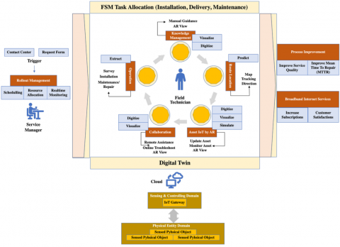 In the realm of information technology, FSM frequently pertains to the administration of installation, maintenance, and repair of hardware and software. In the telecommunications sector, FSM may encompass the maintenance of fiber optic cable network infrastructure [44]. FSM can employ technology like GPS tracking systems, mobile devices, and cloud-based software, including digital twins, to enhance communication and coordination between field technicians and operations centers at headquarters [45]. This technology enables firms to monitor technicians' performance in real time, optimize operational routes and schedules, collaborate with technicians [46], and swiftly address any modifications or concerns that may occur with telecommunications equipment in the field.