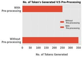 Figure 12 compares the number of tokens generated with and without pre-processing and reveals significant differences in the complexity and efficiency of the text processing pipeline. Without pre-processing, the generation process yields a higher count of 350 tokens, indicating a larger volume of raw text output. In contrast, employing pre-processing techniques reduces the number of tokens generated to 250, showcasing a streamlined and more refined representation of the text. Pre-processing likely involves steps such as tokenization, removal of stop words, stemming, or lemmatization, which eliminate redundant or irrelevant information and standardize the textual data. This reduction in token count not only enhances the readability and interpretability of the generated text but also improves computational efficiency by reducing the computational burden associated with processing larger volumes of unrefined text data.