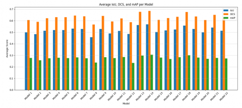 Figure 7. Comparison of IoU, DCS, and mAP per class across 22 Mask R-CNN models