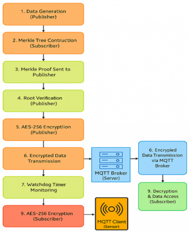 The remaining paper is structured as; Section 2 provides the Literature Review, summarizing recent advancements in securing the MQTT protocol. Section 3 details the Proposed Methodology, outlining the S-MQTT protocol’s integration of AES encryption, Merkle Tree-based authentication, and a Watchdog timer mechanism. Section 4 presents the Results and Discussion, including the simulation environment, performance metrics, and comparative analysis with traditional systems. Finally, Section 5 delivers the Conclusion, highlighting how the proposed protocol effectively mitigates cyberattacks while maintaining efficiency in resource-constrained IoT environments.