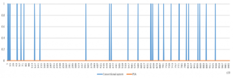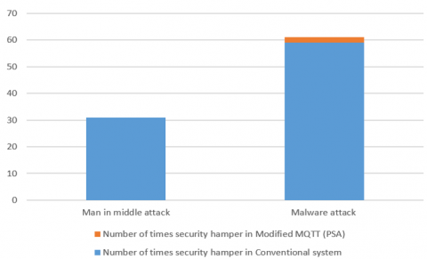 A total of 10000 times an attack has been introduced in the system. For the man-in-middle attack, the results of the behavior of the system are illustrated in Figure 7 and for the malware attack, the results of the behavior of the system are illustrated in Figure 8.