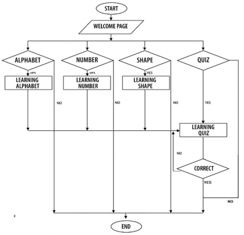 In short this sophisticated and nuanced methodology used in the development of the "Play and Learn Mobile Application" ensures a final product that is technically excellent and pedagogically sound for preschool education. This approach combines educational theories with design principles, technical robustness with user engagement. The marriage of theoretical foundations, design strategies and developmental frameworks ensures a holistic and effective educational tool for young learners.In the development of the system a holistic and comprehensive approach was taken to cater to the educational needs of pre-school children with a focus on alphabet, numbers and shapes. The system design phase was characterized by the creation of a detailed flow chart that visualized the interaction of different components in the application [43-48]. This visual representation was the blueprint for the development team to create an intuitive and engaging learning experience that matches the cognitive abilities of pre-schoolers. The main goal throughout the system development was to deliver age appropriate content with high interactivity. Lessons on alphabet, numbers and shapes were designed with visually appealing representations and audio cues. This was to create a fun and interactive learning environment that resonates with the target audience [49-52]. Quizzes were added as a feature, to test children’s knowledge, track progress and give feedback and rewards. The system design put a big emphasis on user friendly navigation, as we know that pre-schoolers can’t navigate complex interfaces. Simultaneously we considered the technical aspects to make sure it works well on mobile devices. The overall goal of the whole development process was to create a learning environment that is effective and fun for pre-school children. Throughout this process a flow chart played a big role in illustrating the system’s functionalities and interactions. This visualization not only guided the development team but also ensured a coherent and organized approach in creating an educational tool that goes beyond functionality, it should be an immersive and enriching experience for the young minds it’s trying to educate [53-58]. The flowchart in Figure 1 shows the structure and logical interactions of these components, a summary of the app’s educational framework.
