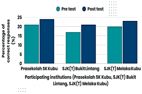Figure 3. Pre test and post test performance across three schools. Y axis: percentage of correct responses (%); X axis: participating institutions (Prasekolah SK Kubu, SJK(T) Bukit Lintang, SJK(T) Melaka Kubu)