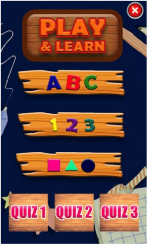 Moving on to the main menu in Figure 6, the layout is thoughtful with 4 buttons for alphabet, numbers, shapes and quizzes. Each button is clearly labeled or has an icon, so it’s clear and accessible. Alphabet is letter recognition and sounds, numbers are numerical concepts, shapes are various geometric forms, and quizzes are interactive assessments. The main menu is designed to make it easy to find and select the area of study you want. Also, the exit button on the menu page is a convenience, so you can exit the app whenever you want. This is a user-friendly design and encourages active participation in the various educational content within the app. The well-designed main menu is not only organized for e-learning but also a catalyst for a fun educational journey in the "Play and Learn" app.