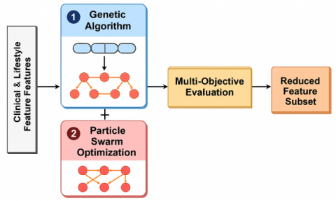 The preference of GA–PSO as opposed to other metaheuristic search algorithms like Differential Evolution (DE) or Ant Colony Optimization (ACO) is based on the use of complementary properties of the two algorithms. Whereas GA maintains a higher degree of exploration through genetic crossover and mutation, PSO maintains a level of exploitation via velocity updates. Thus, GA–PSO offers a compromise - preventing GA from being too random (as sometimes seen in GA), and preventing PSO from converging prematurely (as is sometimes seen in PSO). Prior studies have shown that GA–PSO hybrids achieve better global optima on high-dimensional biomedical datasets than DE, ACO, or either algorithm in isolation, making it suitable for cardiovascular datasets, which use varied clinical features and lifestyle features.