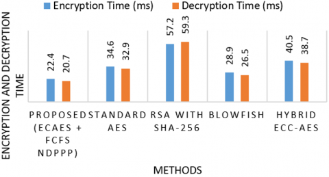 The proposed ECAES with FCFS-based NDPPP protocol demonstrates superior efficiency in both encryption and decryption time when compared to traditional and hybrid encryption schemes shown in Figure 6. With an encryption time of 22.4 ms and a decryption time of 20.7 ms, the proposed method significantly outperforms standard AES and Blowfish take longer due to linear encryption processes. The proposed approach benefits from optimized row-column transformation in Crisscross AES and efficient scheduling through FCFS, ensuring low-latency, high-throughput handling of sensitive mobile healthcare data in hybrid cloud environments.