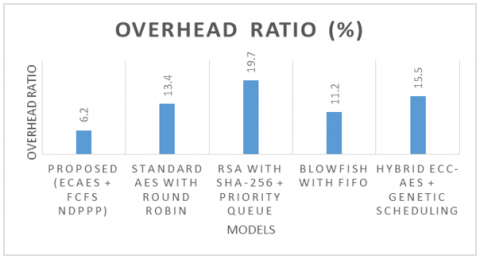 The proposed cryptographic and scheduling framework ECAES with FCFS-based NDPPP protocol achieves the lowest overhead ratio of 6.2%, demonstrating high efficiency in resource utilization shown in Figure 7. This minimal overhead stems from the lightweight nature of Crisscross AES transformations and the simplicity of the FCFS scheduler eliminates complex queue evaluations. The results confirm that the proposed system is optimal for low-overhead, high-security mobile healthcare applications in hybrid cloud environments.