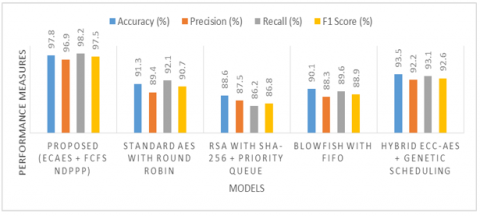 The proposed ECAES with FCFS-based NDPPP framework delivers superior performance across all classification metrics, crucial for secure and reliable mobile healthcare data processing in hybrid clouds shown in Figure 8. The hybrid ECC-AES system performs better but still trails behind the proposed model, which integrates lightweight cryptography with efficient task handling, thereby maximizing both data protection and system responsiveness.