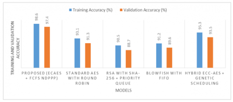 The proposed framework ECAES and FCFS-based NDPPP scheduling achieves the highest training (98.6%) and validation accuracy (97.4%) among all tested systems shown in Figure 9. This indicates robust learning and excellent generalization, even when deployed on unseen mobile healthcare data in hybrid cloud environments. The small gap between training and validation accuracy reflects low overfitting and high reliability. The results validate the proposed approach’s adaptability and accuracy in preserving data privacy and integrity across different operational phases.