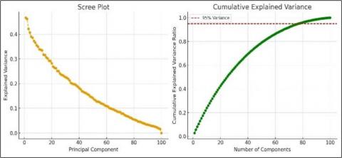 • PCA is used to extract the top N components (e.g., 50–100) that capture the maximum variance in the data. Figure 3. Scree plot (left) and cumulative explained variance ratio (right) for PCA on the face recognition dataset. The scree plot shows the decay of individual component variances, with the first few components capturing the majority of variation. The cumulative variance curve indicates that approximately 70 components retain 95% of total variance, and 100 components capture nearly all signal. We selected a range of 50–100 principal components to balance model expressiveness and robustness: 50 ensures sufficient representation of facial structure under variable lighting and pose, while 100 allows inclusion of subtle discriminative features without overfitting.