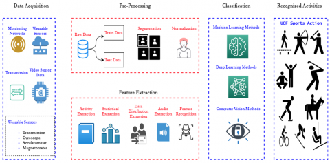 The generic HAR framework involves the following stages: data acquisition, preprocessing, feature extraction and activity recognition, as illustrated in Figure 1.
