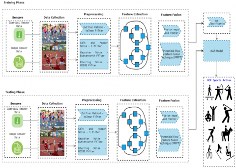 Evaluation and Performance: The method is evaluated on both video-based and sensor-based datasets, such as the UCF Sports and HAR (Human Activity Recognition Using Smartphones) datasets, demonstrating its effectiveness in handling noise and producing accurate activity recognition results. The model achieves high accuracy across both noisy and noiseless data, highlighting the robustness of the noise removal and hybrid feature fusion approach.