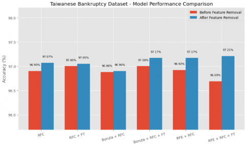 These results confirm that eliminating the least important features does not degrade model performance on the Taiwanese Bankruptcy dataset. In fact, most configurations either maintained or slightly improved their predictive accuracy. Fine-tuning consistently enhanced results across all methods. Notably, both RFE + RFC and Boruta + RFC, when fine-tuned, produced the highest accuracies after feature elimination. This suggests that RFE and Boruta are not only effective at selecting meaningful features but also robust when combined with model optimization.