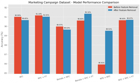 This study addresses this gap by conducting a comparative evaluation of Random Forest, Boruta, and RFE across three publicly available financial datasets: Adult Income, Marketing Campaign, and Taiwanese Bankruptcy. The novelty of this research lies in its multi-dataset framework, consistent evaluation metrics, and focus on how each feature selection method influences model performance when combined with hyperparameter tuning.