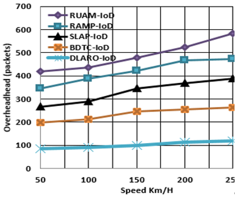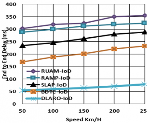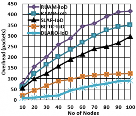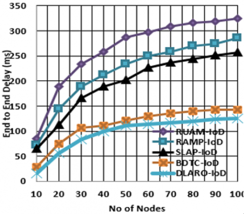 The End-to-End Delay for the proposed DLARO-IOD method is 78.55 ms, in contrast to the previous methods, such as RUAM-IOD, RAMP-IOD, SLAP-IOD, and BDTC-IoD, which have delays of 355.45 ms, 324.19 ms, 287.94 ms, and 233.14 ms, respectively. Consequently, the End-to-End Delay of the proposed DLARO-IOD method is 150 ms less than that of BDTC-IoD, 200 ms less than SLAP-IOD, 230 ms less than RAMP-IOD, and 270 ms less than RUAM-IOD. The Overhead for the proposed DLARO-IOD method is 120 Packets, whereas the earlier methods, such as RUAM-IOD, RAMP-IOD, SLAP-IOD, and BDTC-IOD, have overheads of 583 Packets, 474 Packets, 389 Packets, and 264 Packets, respectively.