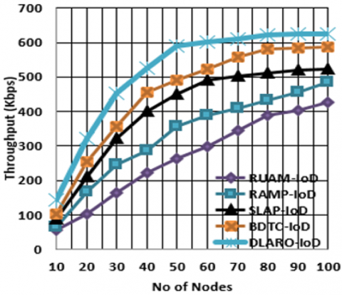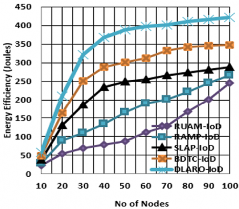 The Energy Efficiency of the proposed DLARO-IOD method is 370 Joules, while the previous techniques, such as RUAM-IOD, RAMP-IOD, SLAP-IOD, and BDTC-IoD, achieve efficiencies of 145 Joules, 298 Joules, 333 Joules, and 367 Joules, respectively. Thus, the Energy Efficiency of the proposed DLARO-IOD method surpasses that of BDTC-IoD by 3 Joules, exceeds SLAP-IOD by 35 Joules, outperforms RAMP-IOD by 70 Joules, and is 220 Joules better than RUAM-IOD. In terms of Throughput, the proposed DLARO-IOD method achieves 780 Kbps, whereas the earlier methods, such as RUAM-IOD, RAMP-IOD, SLAP-IOD, and BDTC-IoD, reach Throughput levels of 301 Kbps, 399 Kbps, 531 Kbps, and 687 Kbps, respectively. Thus, the throughput of the suggested DLARO-IOD method surpasses that of BDTC-IoD by 90 Kbps, exceeds SLAP-IOD by 250 Kbps, outperforms RAMP-IOD by 380 Kbps, and is 480 Kbps greater than RUAM-IOD.