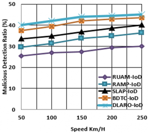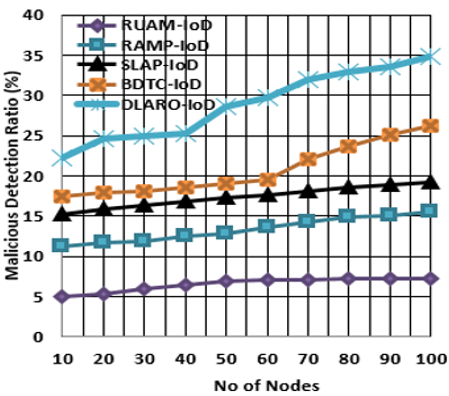 In contrast to the preceding approaches like RUAM-IOD, RAMP-IOD, SLAP-IOD, and BDTC-IoD, which have malicious detection ratios of up to 30.09 percent, 36.47 percent, 40.08 percent, and 43.59 percent, respectively, the proposed DLARO-IOD methodology has a malicious detection ratio of 45.22 percent. Therefore, the suggested DLARO-IOD approach's malicious detection ratio is 1% higher than BDTC-IoD, 5% higher than SLAP-IOD, 9% higher than RAMP-IOD, and 15% higher than RUAM-IOD.