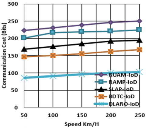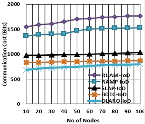 The suggested DLARO-IOD strategy has a communication cost of 102.49 bits, while the previous approaches, including RUAM-IOD, RAMP-IOD, SLAP-IOD, and BDTC-IoD, have communication costs of up to 250.45 bits, 224.37 bits, 194.31 bits, and 167.24 bits. The Communication Cost associated with the proposed DLARO-IOD method is 60 Bits less than that of BDTC-IoD, 90 Bits less than SLAP-IOD, 120 Bits less than RAMP-IOD, and 150 Bits less than RUAM-IOD. The Data Success Ratio for the proposed DLARO-IOD method stands at 95.34 %, in contrast to the earlier methods such as RUAM-IOD, RAMP-IOD, SLAP-IOD, and BDTC-IoD, which achieve ratios of 68.57 %, 75.46 %, 81.61 %, and 89.66 % respectively. Thus, the Data Success Ratio of the proposed DLARO-IOD method is 6 % superior to that of BDTC-IoD, 14 % superior to SLAP-IOD, 20 % superior to RAMP-IOD, and 27 % superior to RUAM-IOD.