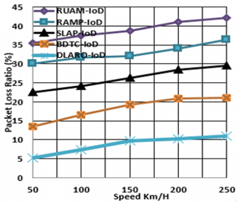 The Packet Loss Ratio for the proposed DLARO-IOD method is 10.98%, in contrast to the earlier techniques such as RUAM-IOD, RAMP-IOD, SLAP-IOD, and BDTC-IoD, which exhibit ratios of 42.16%, 36.44%, 29.45%, and 21.03%. So, the Packet Loss Ratio of the proposed DLARO-IOD approach is 10 % lower than BDTC-IoD, 19 % lower than SLAP-IOD, 26 % lower than RAMP-IOD, and 32 % lower than RUAM-IOD.