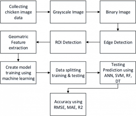This study was conducted in several stages, as outlined below. The first step involved the collection of chicken images. In the second step, image preprocessing was performed, where digital image processing techniques were applied to enhance and prepare the chicken images for further analysis. The third step involved feature extraction, where geometric feature extraction methods were employed to capture key characteristics from the chicken images. The fourth and final step was weight prediction, in which training and testing data were processed using machine learning algorithms. A detailed overview of the research stages is presented in Figure 1.