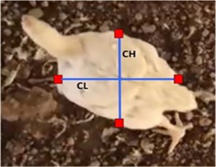 The measurement of the chicken's length (CL) is calculated using the distance between two pixels, applying the formula provided by Chen et al. [42]. This process is performed on a total of 100 chickens to obtain the geometric values for CL, CH, A, P, AR, and M.
