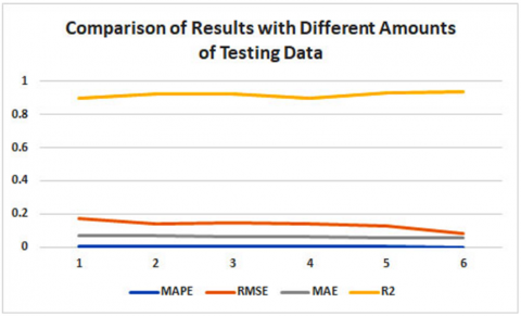 From the 6 experiments, it was observed that the values of MAPE, RMSE, and MAE decreased as the size of the training data increased and the testing data size decreased. This indicates that a larger training dataset helps reduce the error rate. Conversely, the R² value increased, demonstrating that as the amount of training data increases and the testing data decreases, the coefficient of determination becomes larger, suggesting improved model accuracy. The detailed statistical results from these experiments are presented in Table 2 and Figure 6.
