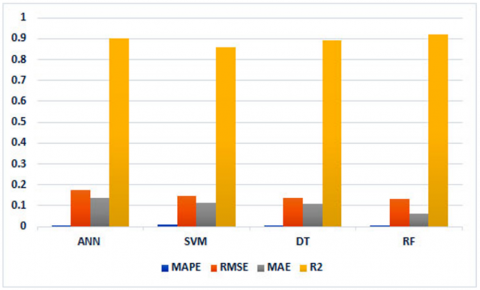The accuracy of the model is evaluated using validation metrics such as Root Mean Square Error (RMSE), Mean Absolute Error (MAE), and the coefficient of determination (R²). The optimal model is determined by selecting the prediction with the lowest RMSE and MAE values, while the highest R² value indicates the best model fit [39, 40]. The formulas for RMSE, MAE, and R² are described in Eqs. (2)-(5). Where $Y_{d a}$ is the actual value, $Y_{d p}$ a is the predicted value, $Y_{d w}$ is the average predicted value, and $n$ is the number of available data points [41].