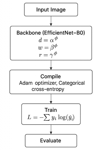 Prior to model training, all images were resized to 224 × 224 pixels with three RGB color channels [18], conforming to the input size requirements of both EfficientNet-B0 and ViT. Each image was normalized by scaling the pixel values to the range of [0, 1]. The categorical labels were encoded as integers and then converted into one-hot encoded vectors to accommodate the multi-class classification setting.